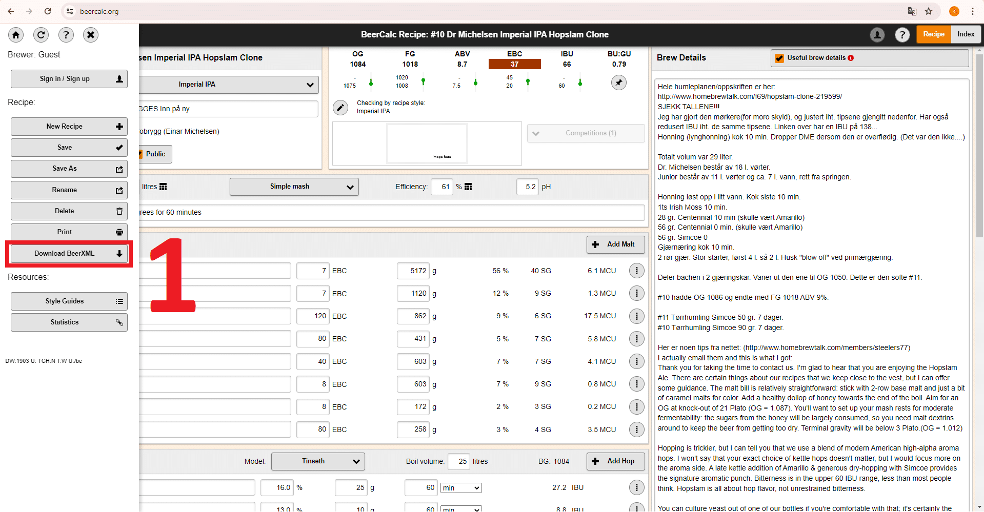 - Når du er inne på den aktuelle oppskriften, trykk «Menu»-knappen øverst til venstre, og velg «Download Beer XML». (Se illustrasjon her)
