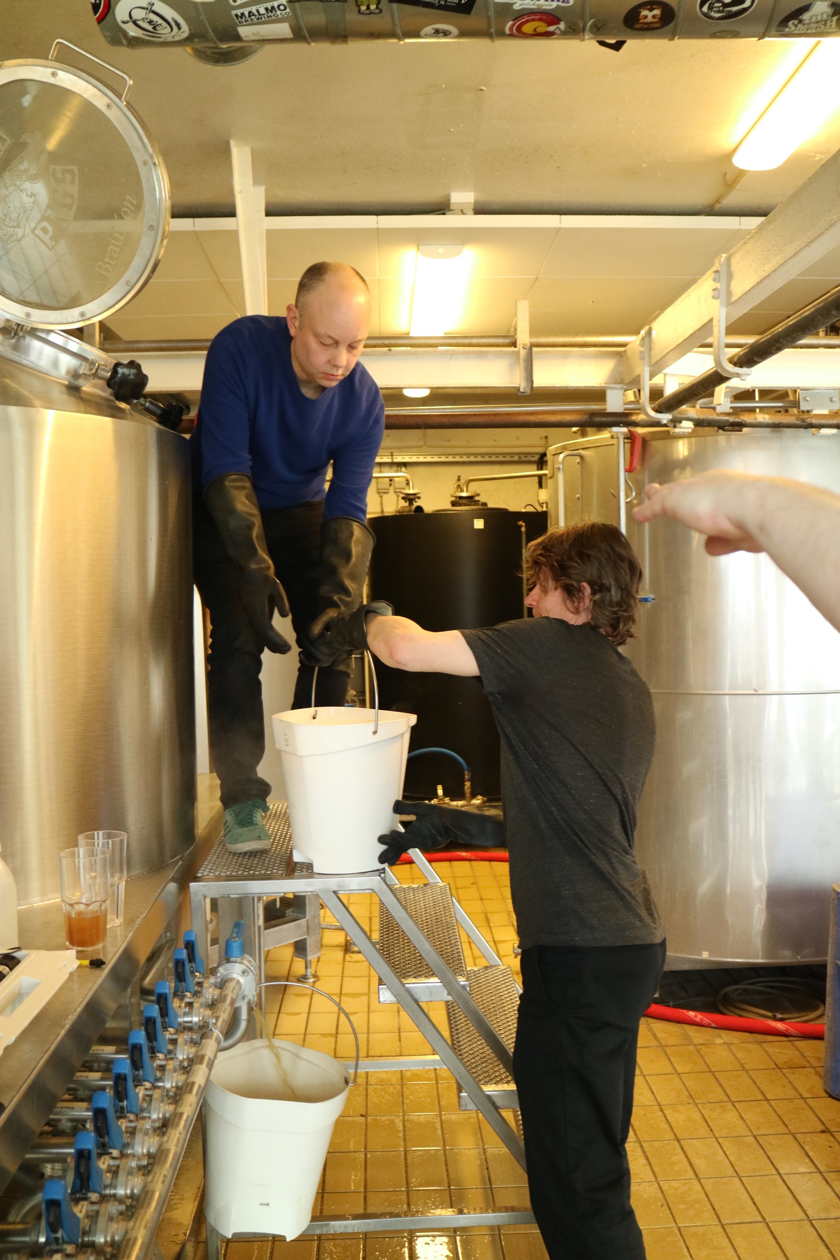 Dermed måtte Andreas og Bjørn Lodve trå til og manuelt overføre hundrevis av liter med vørter med bøtter til kokekjelen.