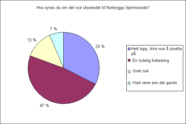 Alt i alt ble det avgitt 46 stemmer mellom 25.11.2007 og 18.12.2007. Det var veldig hyggelig med slik positiv tilbakemelding! Meningen er å holde nettsiden til Norbrygg oppdatert slik at den kan fortsette å være en nyhetsportal med fokus på hjemmebrygging. Samtidig skal nettsiden fungere som inngangsportal for ‘ferskinger i gamet’, hvor det er informasjon om selve hobbyen samt aktiviteter som organiseres rundt det. Vi oppfordrer derfor våre medlemmer til å bidra aktivt til nettsiden og foreningen generelt. Spørsmål, men også kritiske lyder, rettes gjerne til informasjonsansvarlig i Norbrygg (se kontaktinfo i menyen).