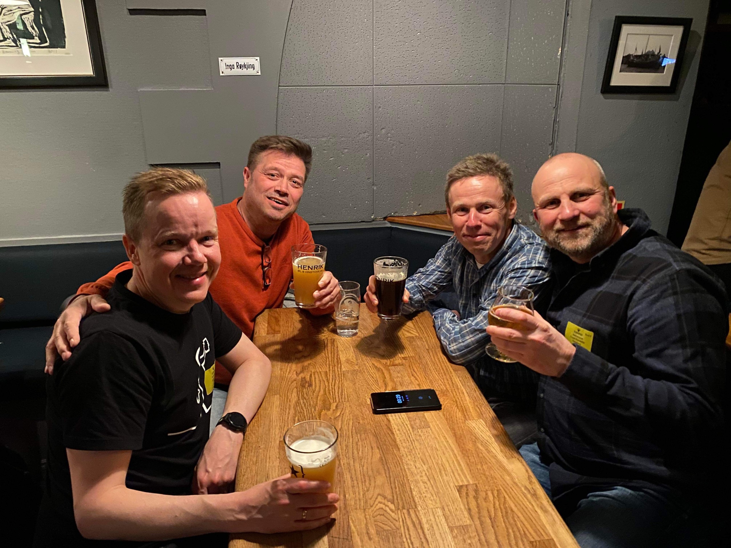 Gjenvalgte sentralstyremedlemmer rundt bordet på Henrik Øl- og vinstove: Jørgen Olsen (til venstre) ble valgt til ny leder. Morten Sevland, Sondre Hågensen (nestleder) og Rudolf Krondorfer tok også gjenvalg. Nye sentralstyremedlemmer som ikke er med på bildet er Roy-Trygve Vabø, Leif Reve og Brynjar Myren.